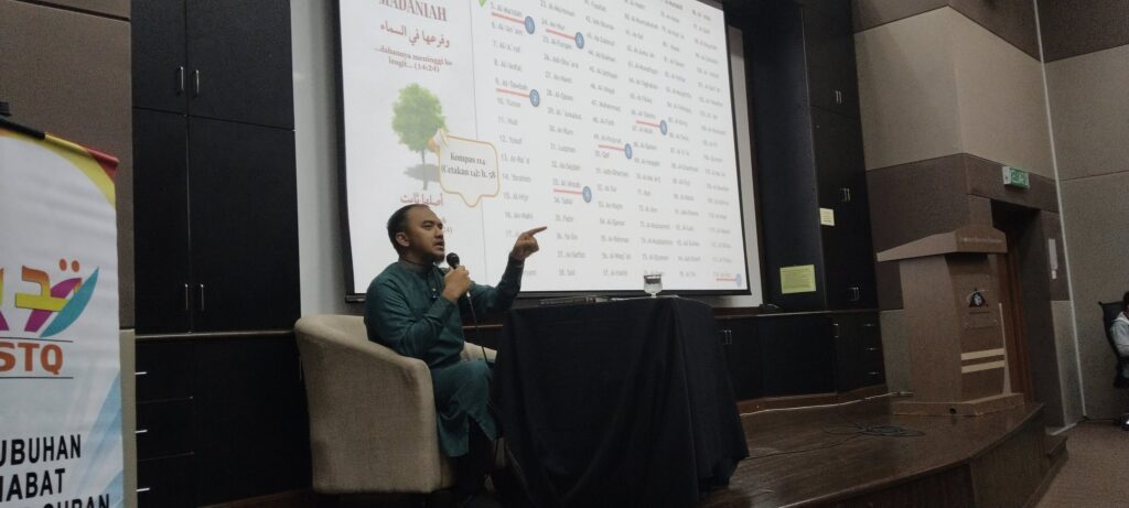 The invited panel, Ustaz Syaari Abdul Rahman, the Main Trainer of the Tadabbur Centre, successfully attracted the interest of the participants from the beginning of the seminar until the end of the evening session with the resolution to continue to meditate with the Al-Quran through the 7 trees that were presented.