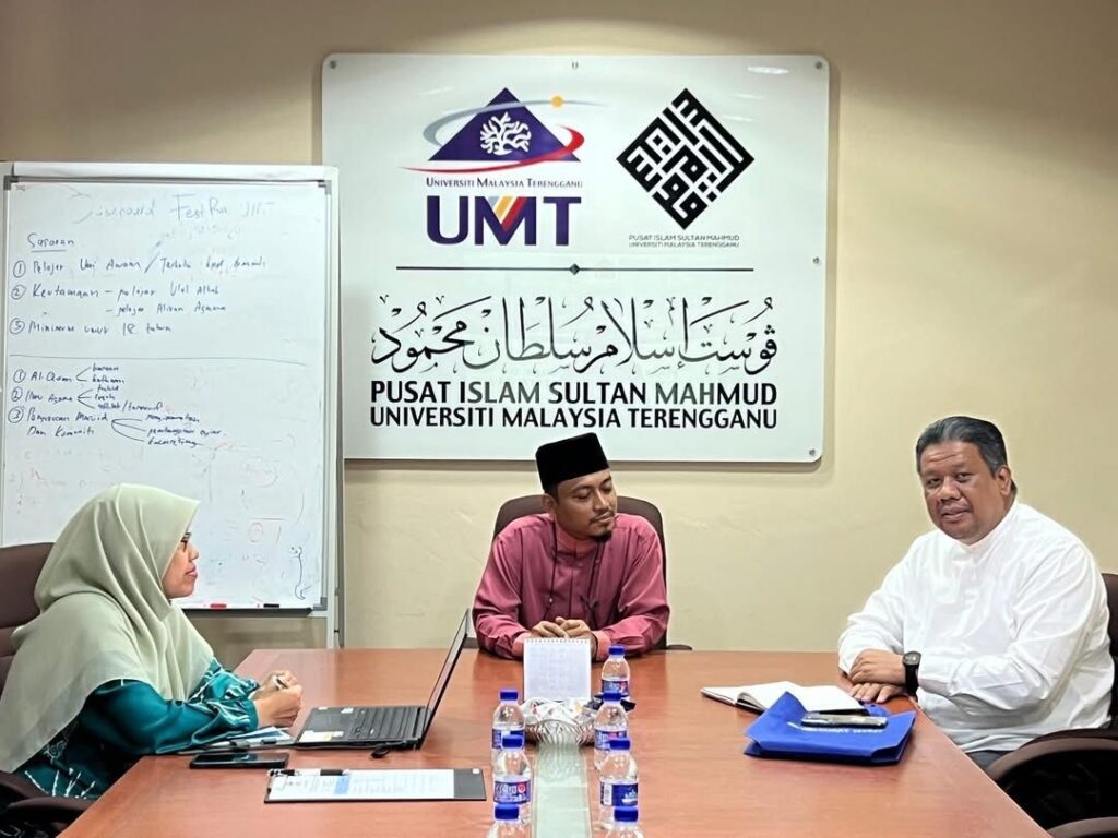 Kuala Nerus, 24 August 2025 – The Sultan Mahmud Islamic Center, Universiti Malaysia Terengganu (UMT) received a courtesy visit from the Director of the Islamic Center of Universiti Sains Islam Malaysia (USIM), Mr. Razman bin Ibrahim, located in the Main Meeting Room, Sultan Mahmud Islamic Center UMT.
